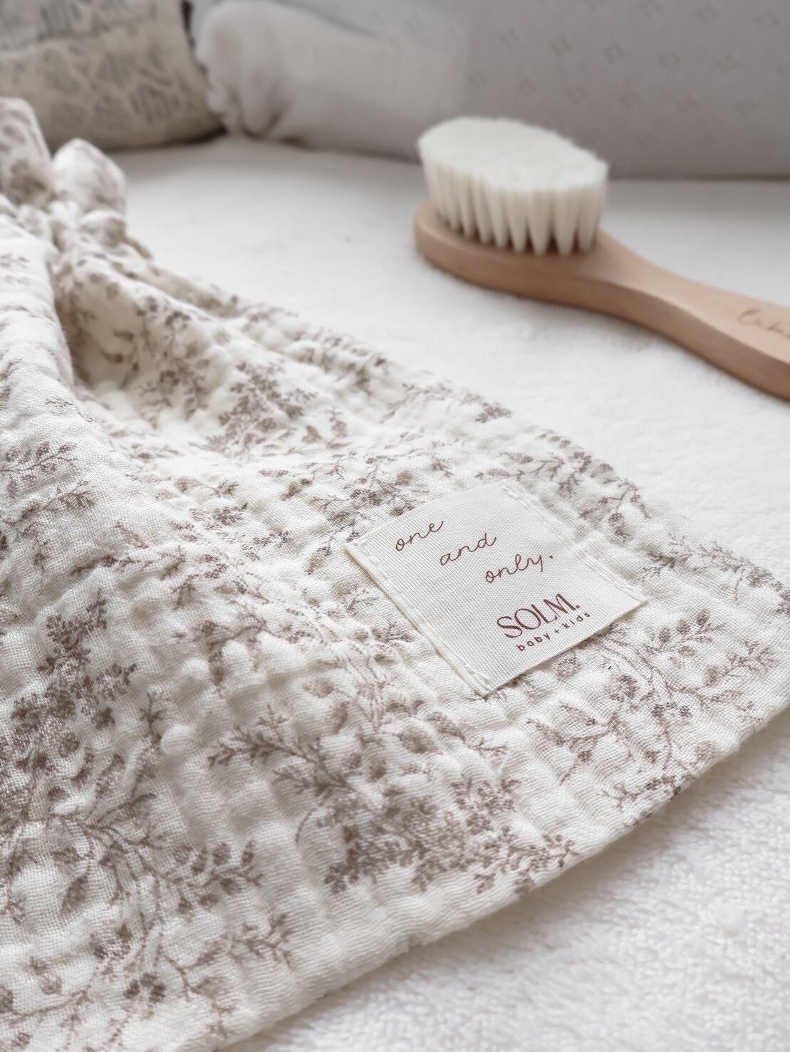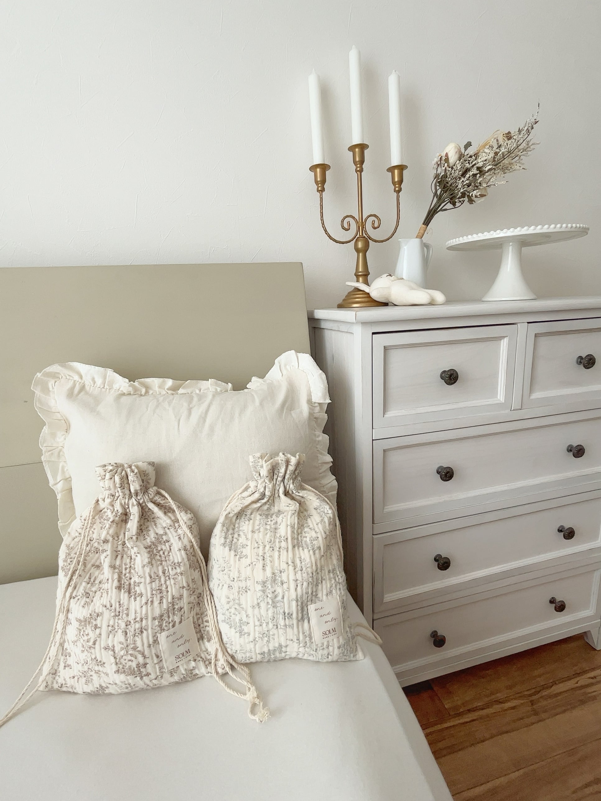 繊細なfloralプリントは巾着でもガーゼケットでもとても好評です。ギフトなどにも喜ばれるシンプル且つより大人めなデザイン。