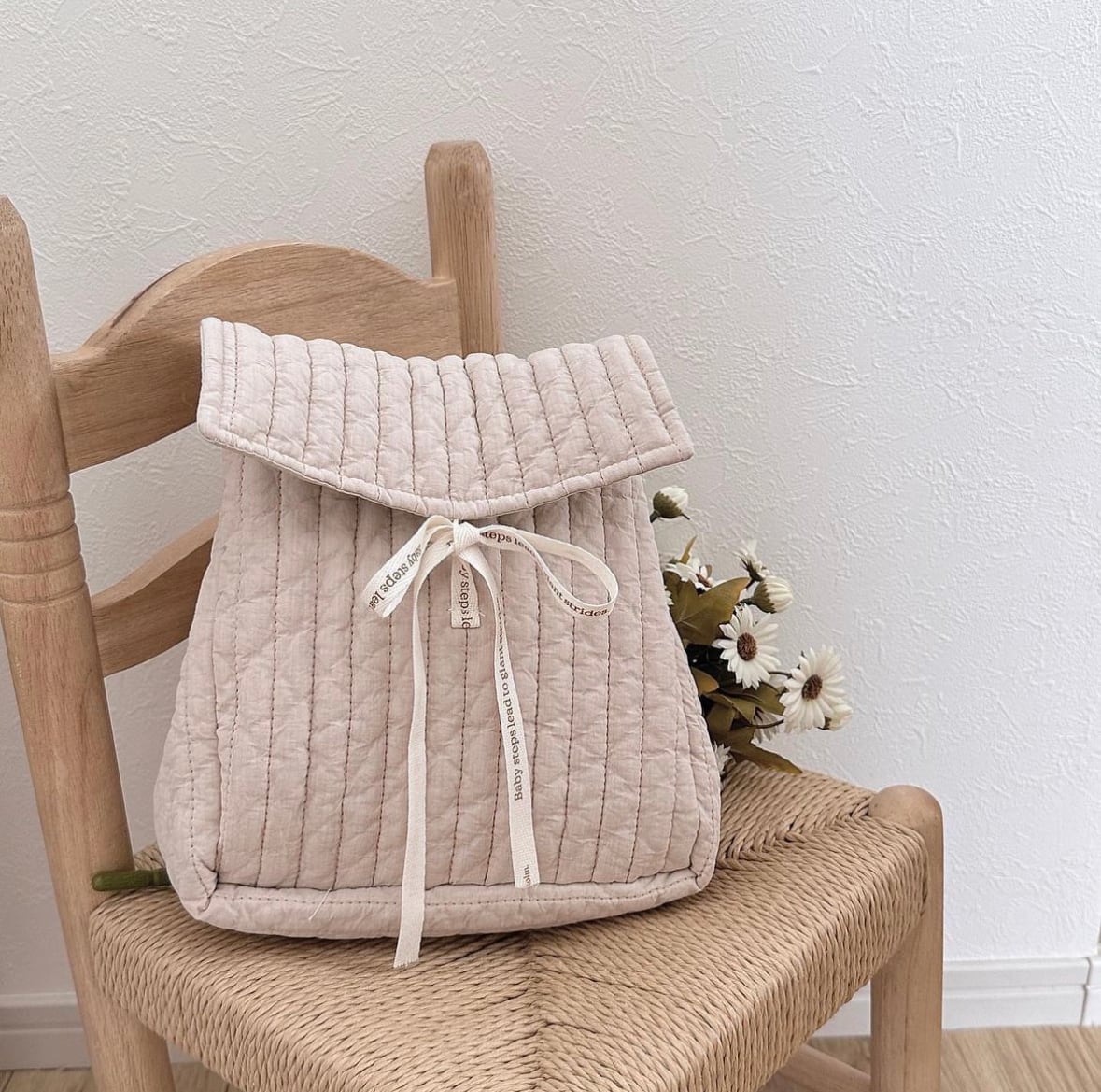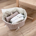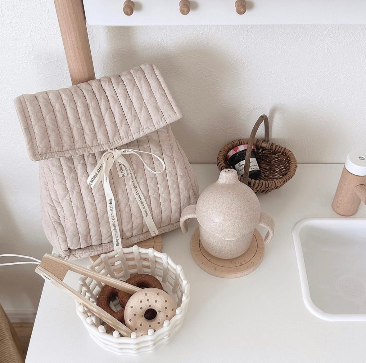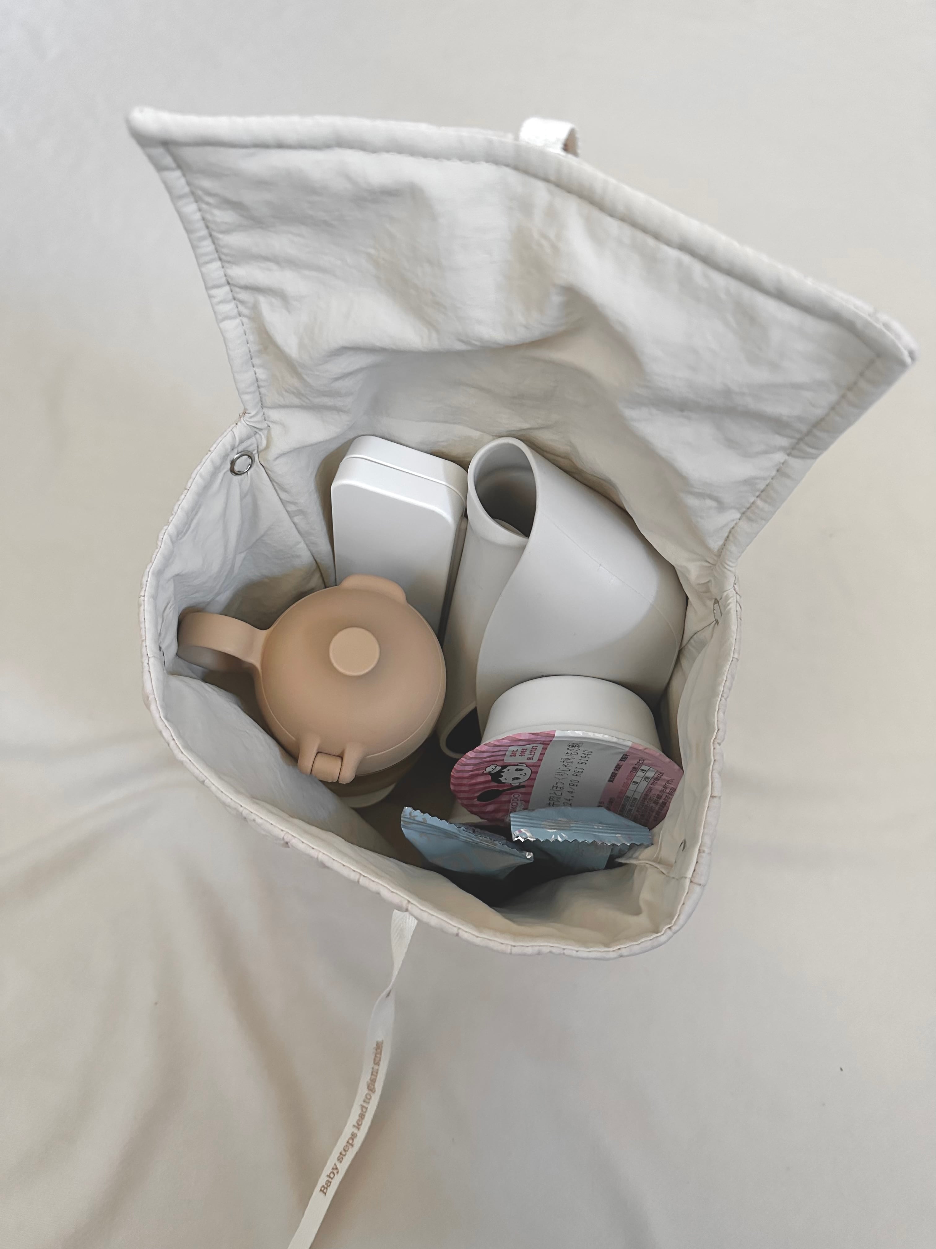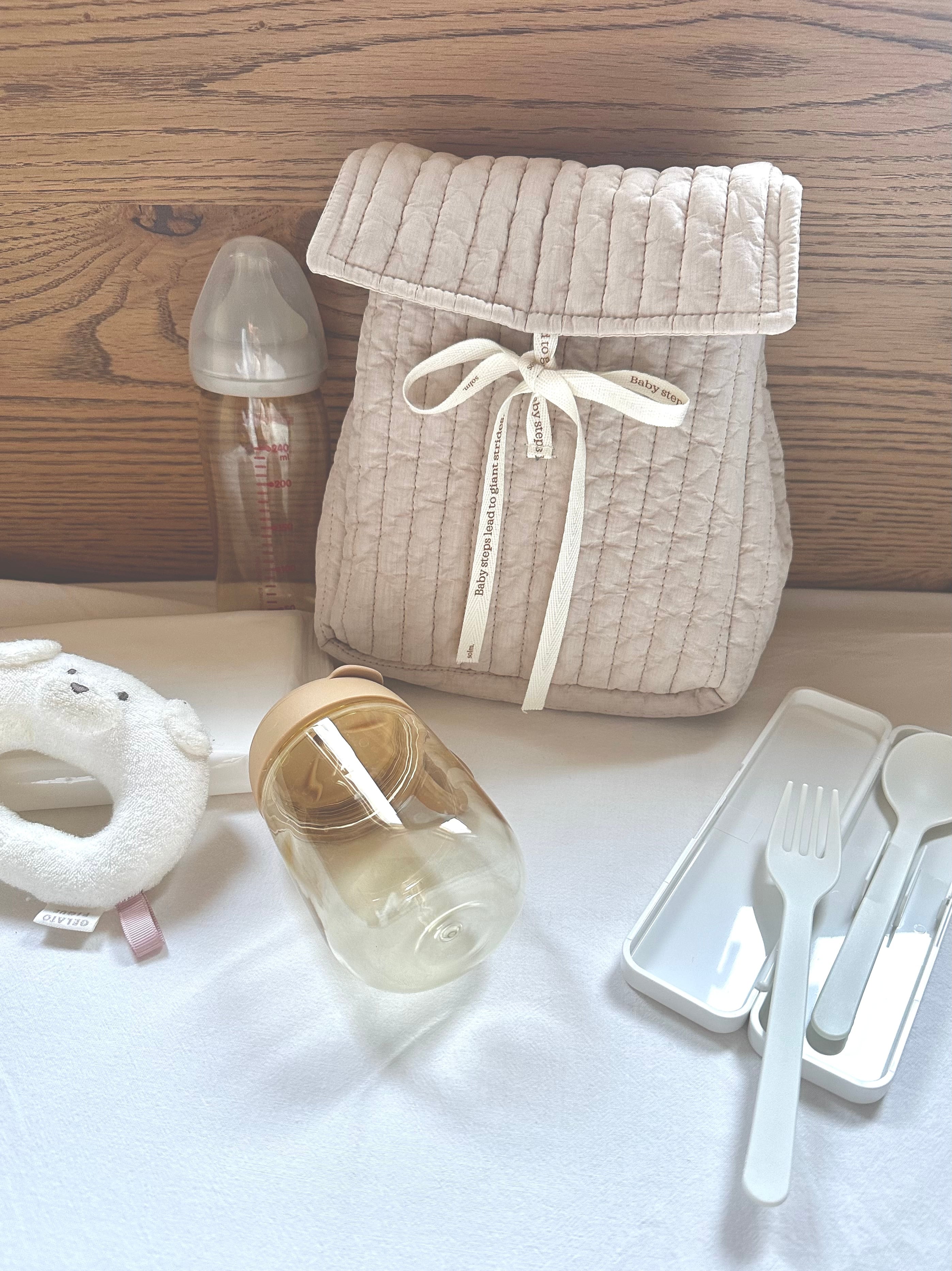 ロゴプリントのリボンで高さ調整ができ、哺乳瓶などのサイズにもフィット。